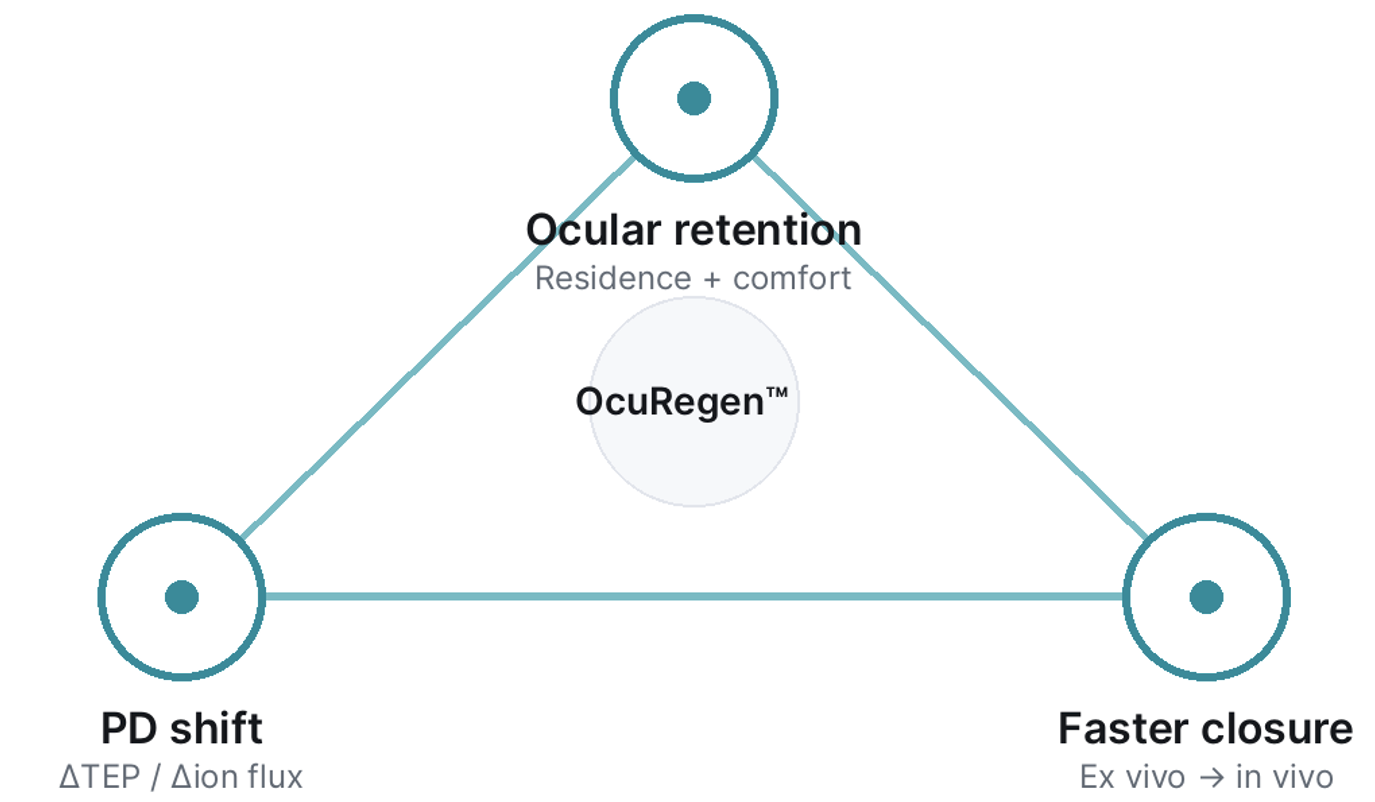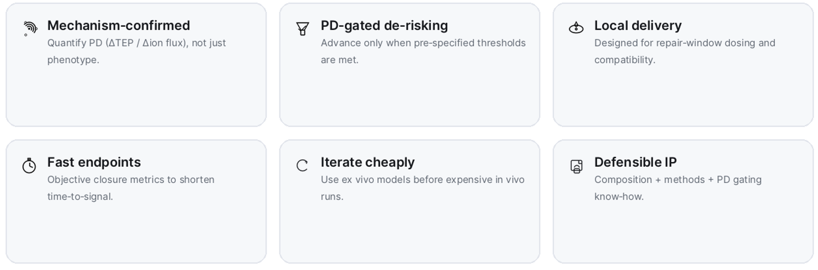 We instrument pharmacodynamics, pre‑specify gates, and iterate. For OcuRegen™, we screen candidates with PD readouts (ΔTEP / Δion flux) and functional closure assays ex vivo, then validate in vivo once the mechanism‑to‑effect link is established. This is how a platform becomes repeatable.