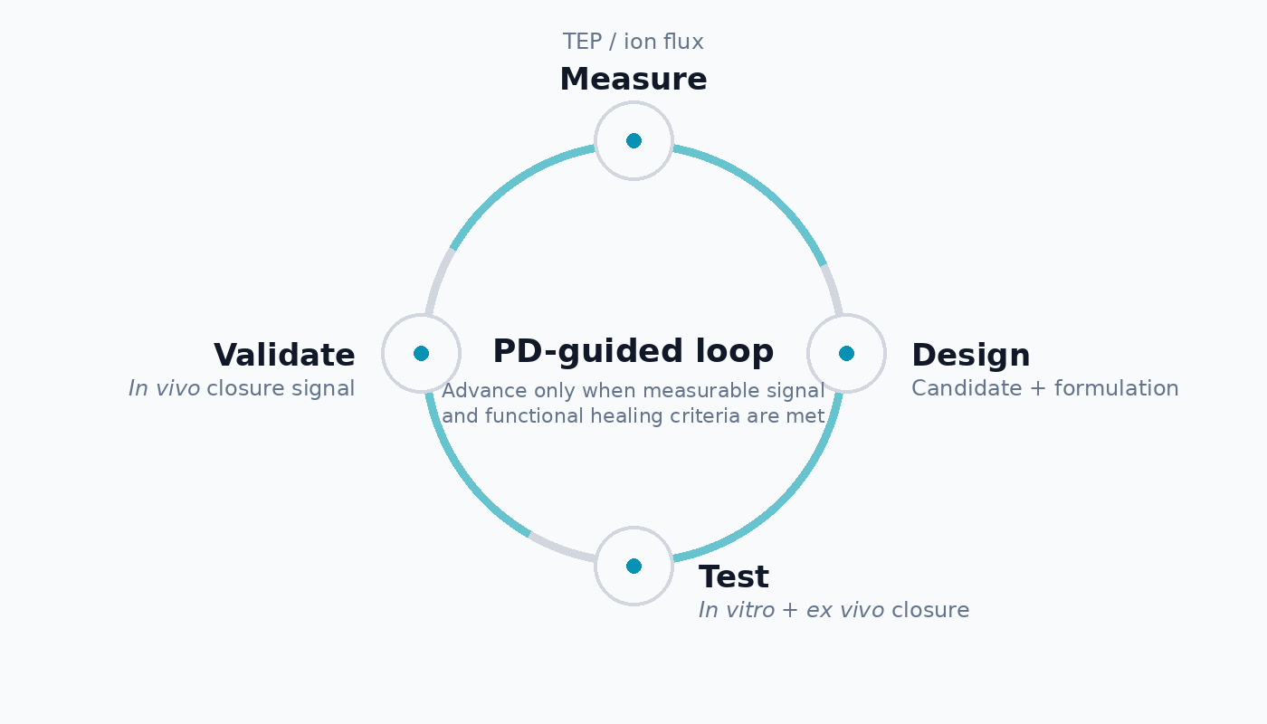 Our approach is to restore the signal, then verify it with pharmacodynamics (PD): ΔTEP / Δion flux. This turns bioelectricity from an observation into an engineering variable.