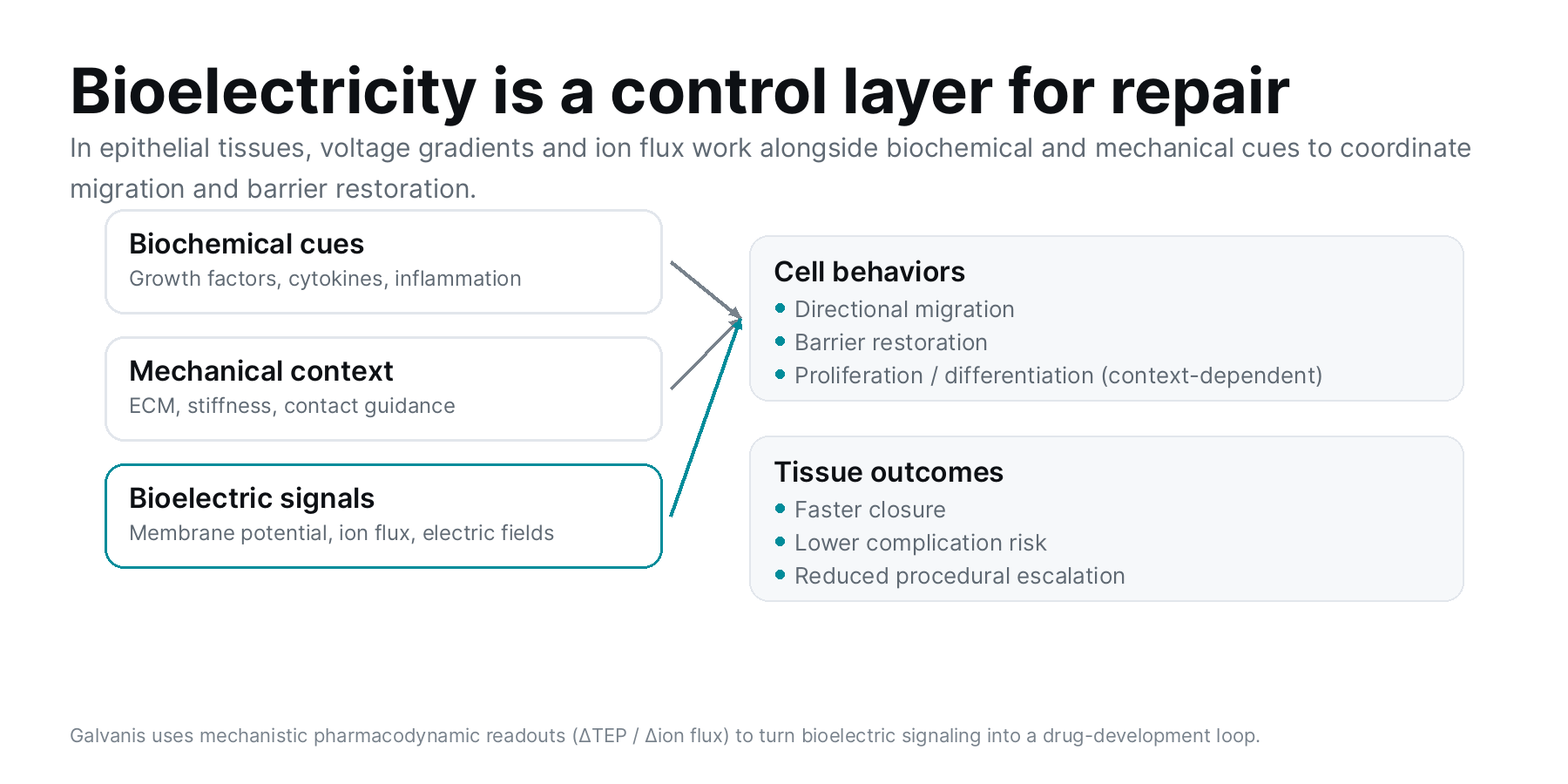 Epithelial tissues maintain voltage gradients and ion transport that shape cell migration. In impaired healing, those signals can be reduced; cells lose directional guidance and closure stalls.