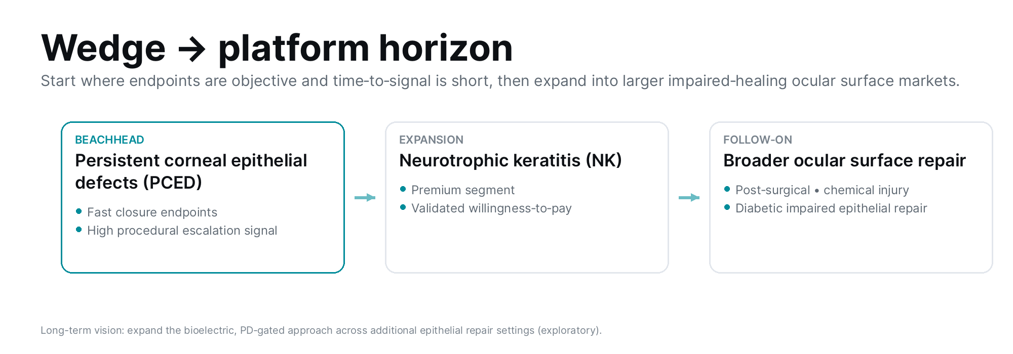 Ocular surface repair is the lead application because the biology is accessible, the readouts are objective, and the development path is efficient.