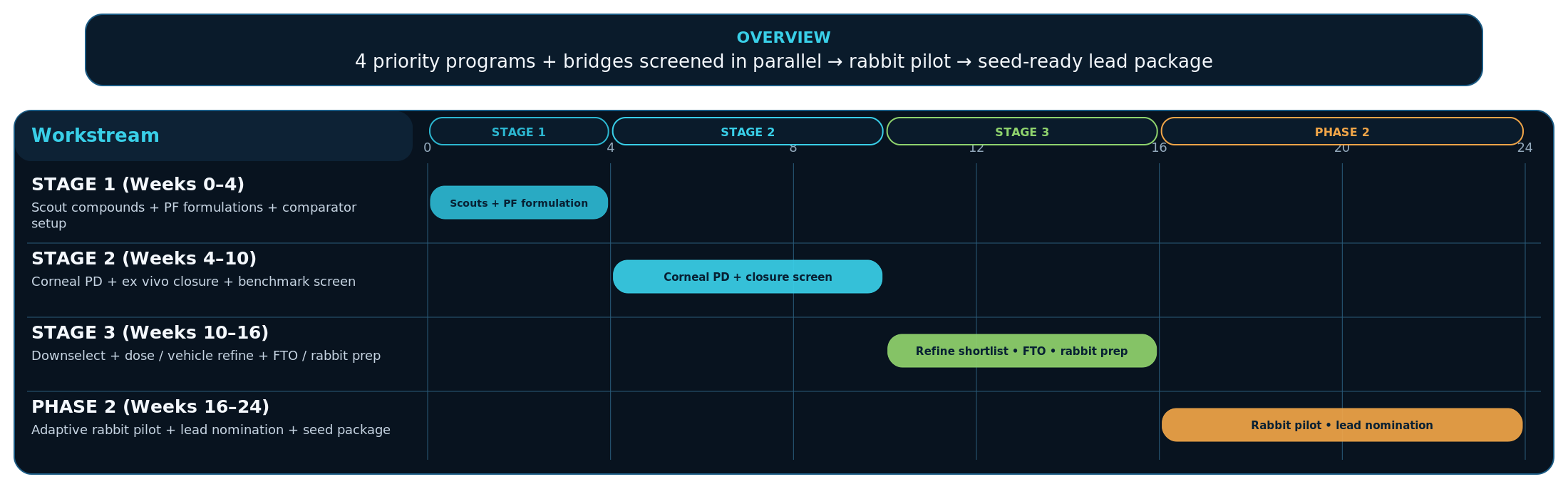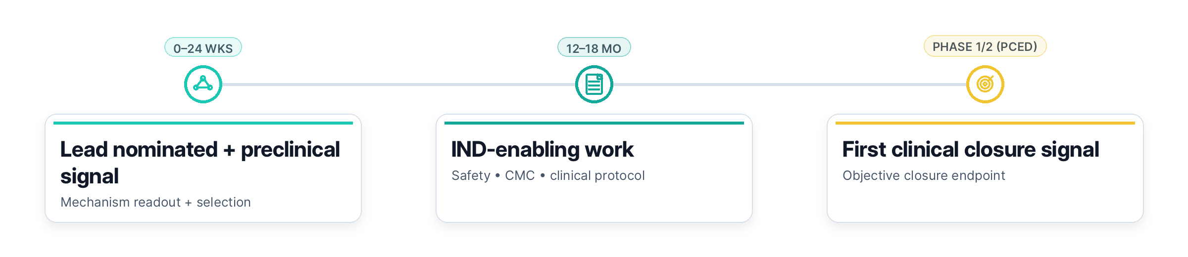 PCED beachhead. PD gated development. 24-week plan to lead nomination and in vivo closure signal.