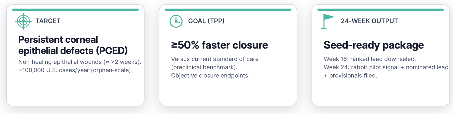 PCED enables short trials with objective epithelial closure endpoints. We plan to pursue Orphan Drug + Fast Track while building mechanistic PD→closure linkage and preparing IND‑enabling work post‑seed.