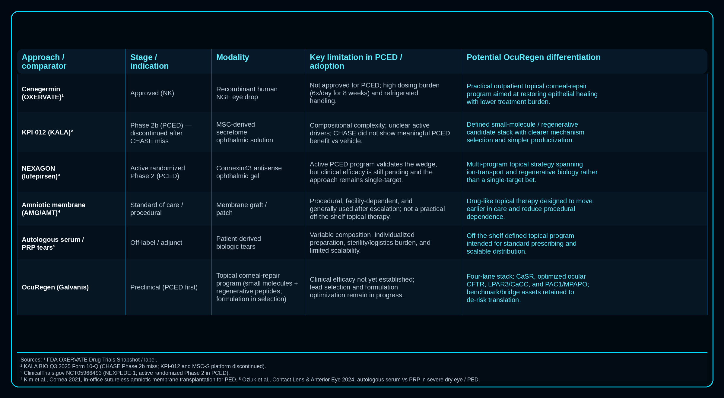 OcuRegen™ is a defined eye‑drop program for impaired corneal epithelial repair. We start in PCED because endpoints are objective, time‑to‑signal is short, and local delivery is straightforward.