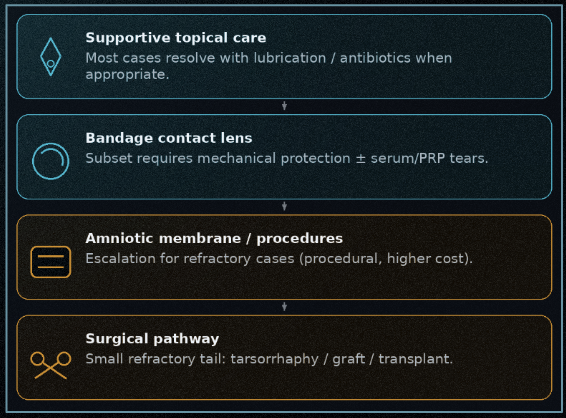 Persistent epithelial defects are conventionally defined at ~2+ weeks of non‑healing. When closure fails, patients escalate through successive interventions; each step increasing cost, morbidity, and time‑to‑closure.