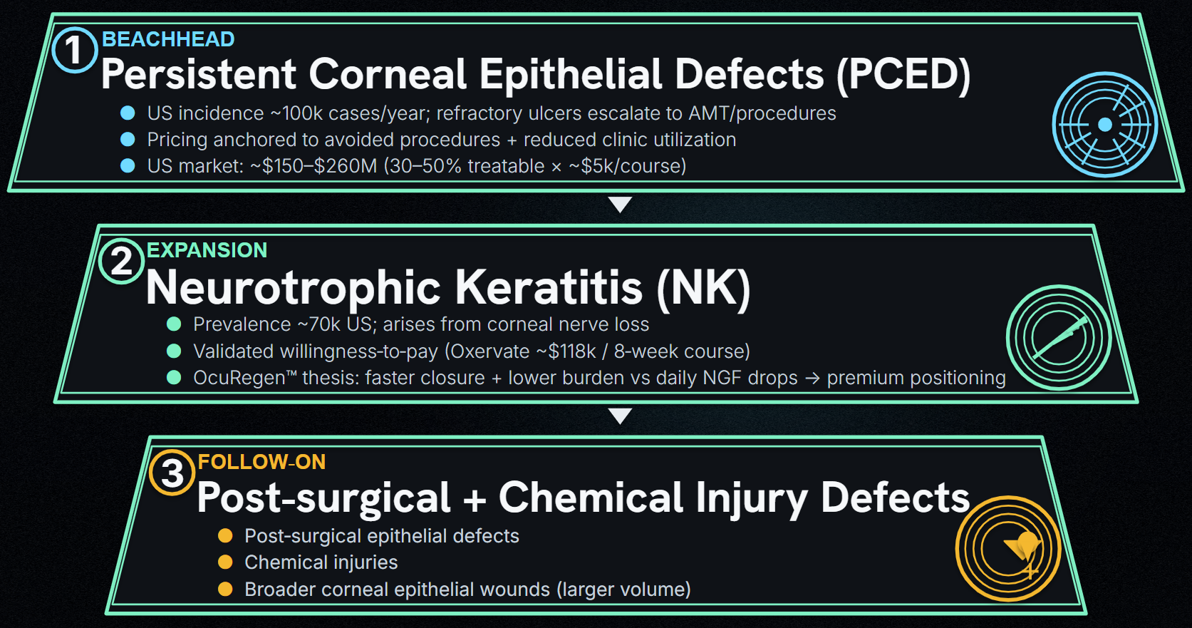PCED is the beachhead, followed by expansion into neurotrophic keratitis (NK) and broader impaired-healing surface indications, leveraging the same approach.