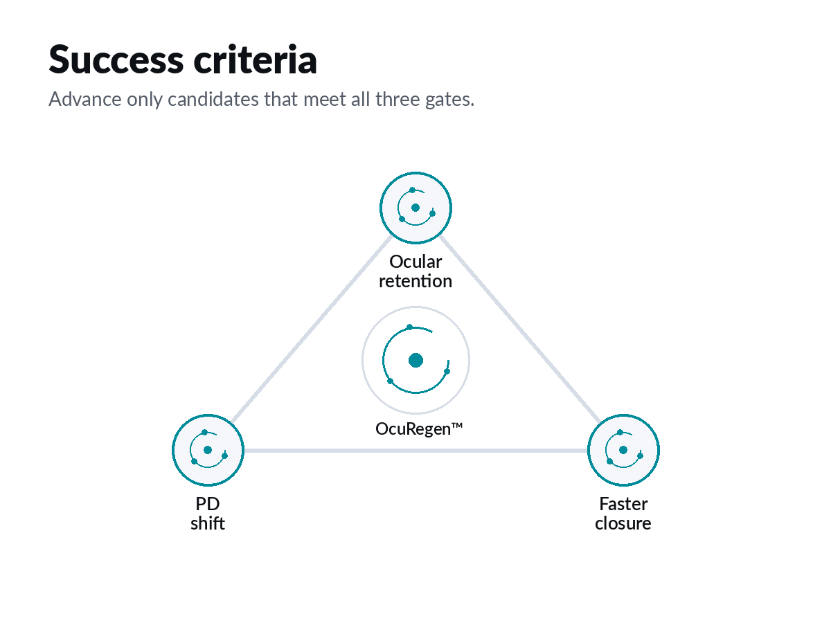 Galvanis is building PD-gated topical bioelectric therapies for corneal repair. Corneal wounds generate measurable endogenous electric currents, and human donor corneas show those currents can be chemically modulated. Our pre-seed program does not bet the company on a single modality belief. Only candidates that preserve barrier function, increase corneal wound TEP, and improve closure advance. That gives OcuRegen™ a faster developmental path.