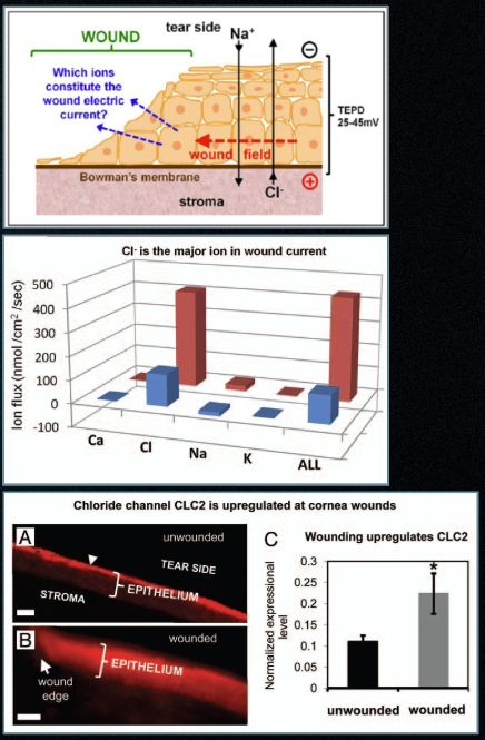 Human donor corneas show those wound currents can be pharmacologically increased. Chloride is a major carrier of corneal wound current, and both aminophylline and chloride-free conditions have been shown to increase wound current in human corneal tissue.